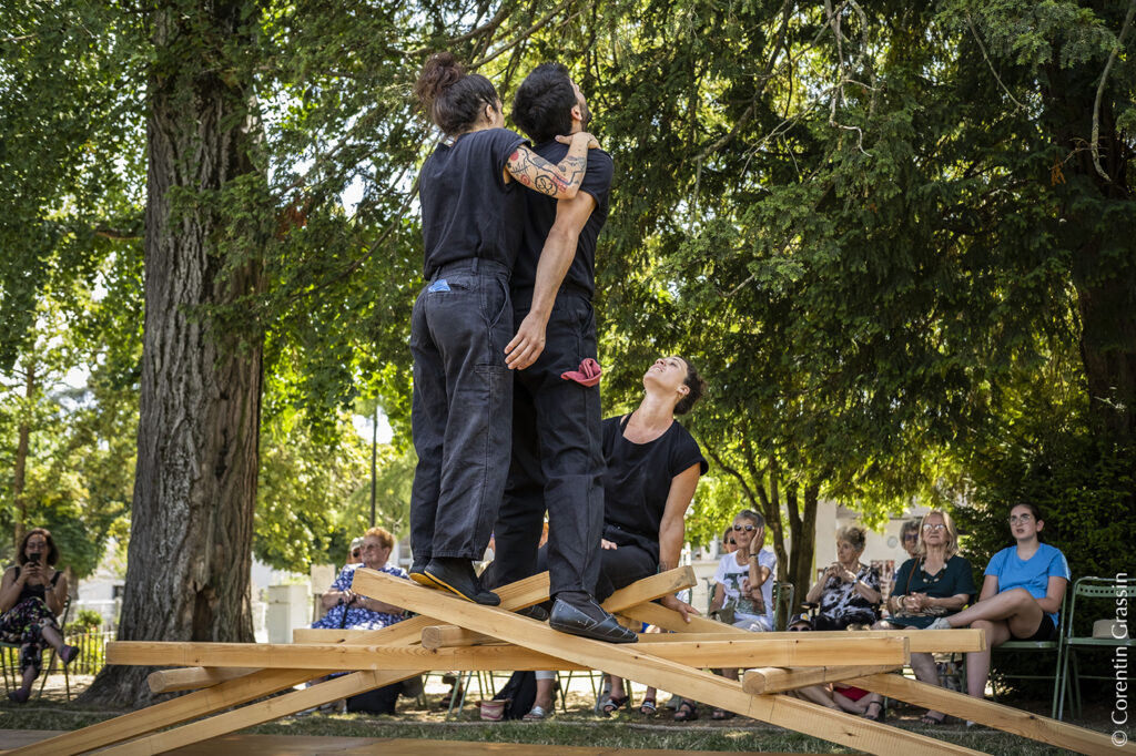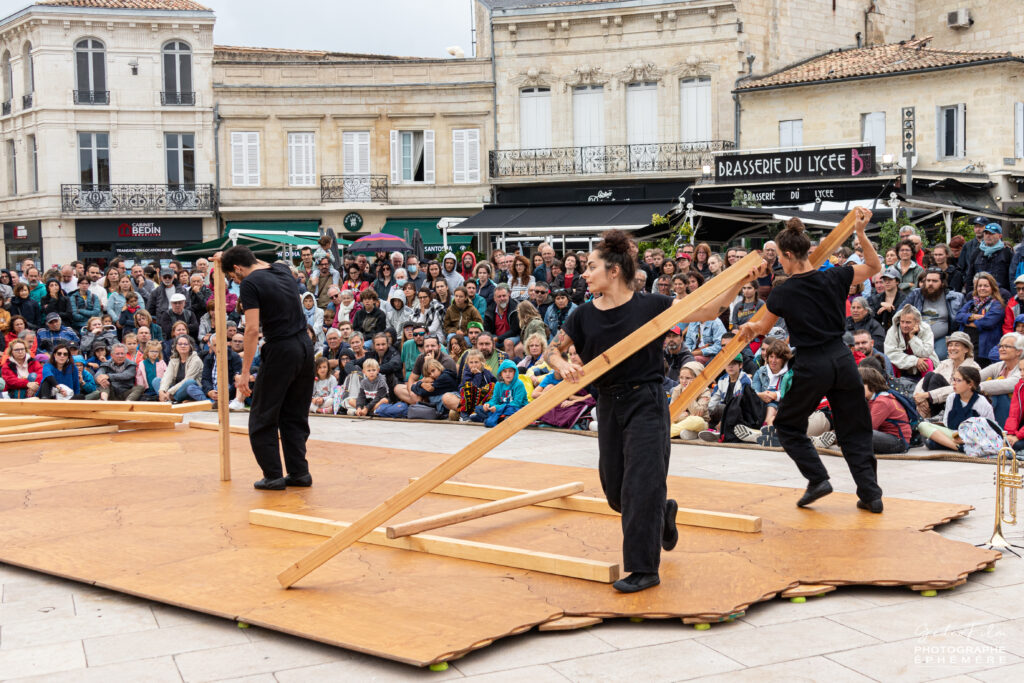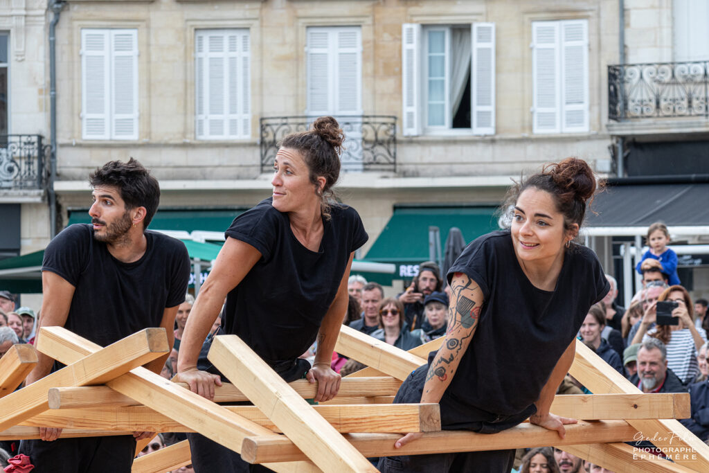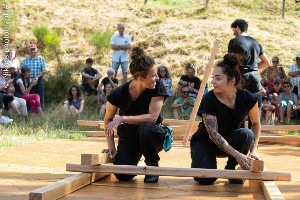 « Ils sont trois. Trois circassiens sans leurs agrès mais réunies autour de 128 kilos de Mélèze. Ils jouent avec ces poutres, ces simples « bouts de bois », à des jeux dont les règles nous échappent. Puis petit à petit une structure apparaît.