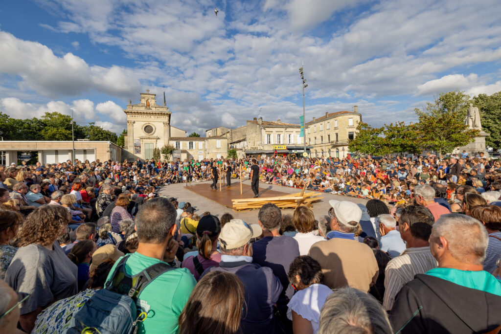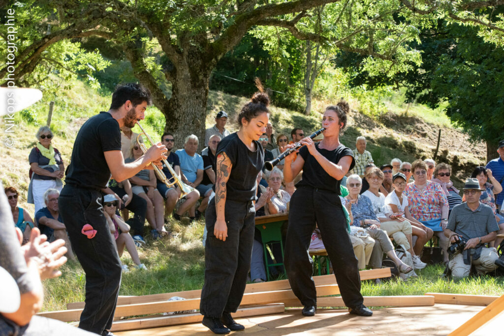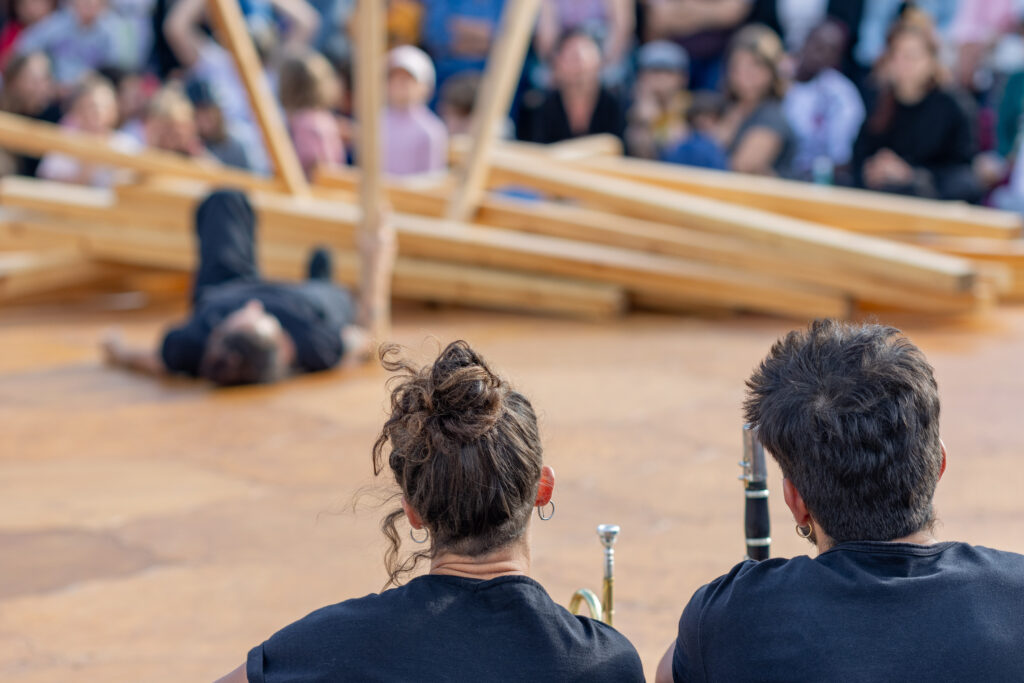 128 kilos de Mélèze est un spectacle de rue pluridisciplinaire (portés et acrobaties au sol, danse, musique live…)